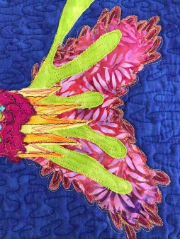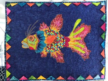 The pieces were fused down using a fusible web that can be repositioned.  Tull was used either over the entire fish or just certain parts, however you wanted.  This process was very freeing.  I named the first fish Elton Johnfish because it looks like he’s wearing wild glasses.
