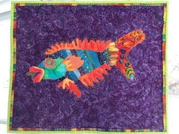 After the fish were completed, I positioned them on a background fabric.  Some thread enhancement was done at this point.  Then batting and backing were added and more machine quilting was done, to further enhance the fish and to quilt the background.