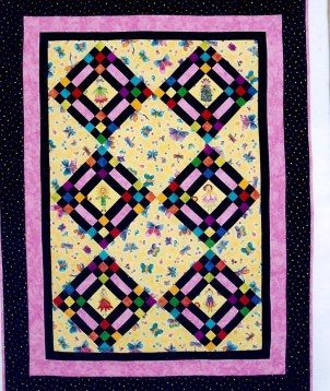 I used the bright colors from the butterfly and flower girl fabrics in the nine patches.  The quilt has triple borders, black with bright dots and the same  pink that was used to frame the blocks.