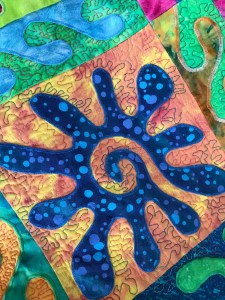 I free-motion machine quilted this quilt using only a meandering design and quilting in the non-fused sections so where I quilted was entirely random depending on placement of the design pieces.  I quilted a wave design in the outside border similar to the wave in the sashing.