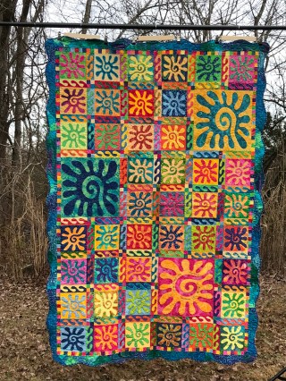 So it didn’t become boring with similar size blocks, there are three giant sun blocks thrown in.  All the raw edges are satin stitched.  I used rayon thread throughout the quilt for the satin stitching and for the machine quilting.  I think I bought as many colors of thread as I did fabric.