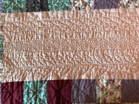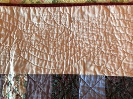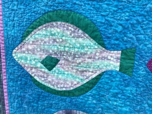 quilt. This idea came to me when I was almost done quilting and remembered eating whole flounder at a seafood restaurant in Buxton, NC where they cross-hatch scored the flounder before cooking it. I wished I had thought of that before and quilted all the flounder that way (not the first time I thought of a better way to do something after the fact).