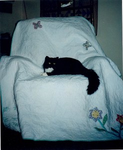 I took a free motion machine quilting class in March of 1998 and did a free motion meander quilting in the background after that class. It scared me to pieces to put this finished quilt under my sewing machine needle and free motion quilt, but it turned out okay and the background needed something. Sometimes you just have to hold your nose and jump in!